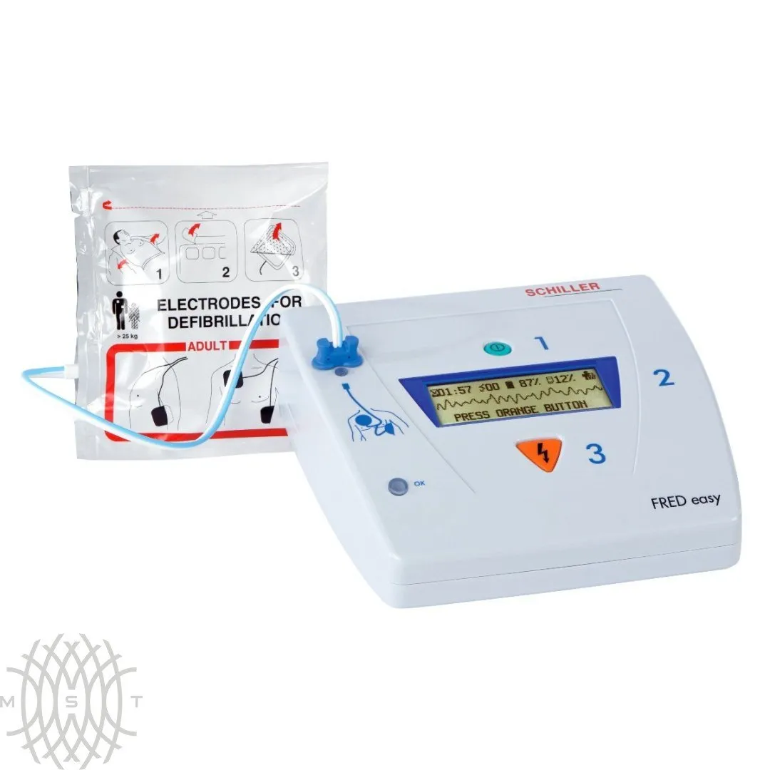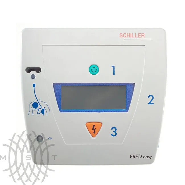 Автоматический наружный дефибриллятор Schiller Fred Easy предназначен для проведения сердечно-легочной реанимации в экстренных ситуациях и в условиях стесненного пространства (в самолетах, поездах). В нем реализована система голосовых оповещений на русском языке. На жидкокристаллический дисплей выводятся визуальные инструкции, время процедуры, число разрядов, уровень заряда аккумулятора, вид применяемых электродов. Аппарат поддерживает функцию автоматического самотестирования и особый аналитический алгоритм для определения фибрилляции. Прибор не нуждается в долгой настройке, так как электроды уже подсоединены к корпусу.